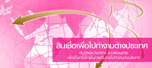 ทำให้เรื่องค่าใช้จ่ายในการเดินทางไปทำงานต่างประเทศของคุณไม่ยากลำบาก กับสินเชื่อเพื่อไปทำงานต่างประเทศ ด้วยเงินกู้ ที่ให้คุณผ่อนชำระได้ แล้วคุณจะไม่ต้องกังวลเรื่องค่าใช้จ่ายในการเดินทางไปทำงานต่างประเทศอีกต่อไป